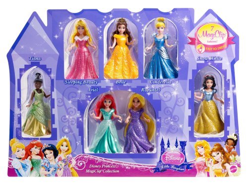 Disney Princess Little Kingdom Magiclip 7-Doll Giftset: Seven adorable Disney Princess small dolls are available together in one beautiful gift set. Girls will love reenacting their favorite moments in the fairytales of Rapunzel, Ariel, Belle, Cinderella, Sleeping Beauty, Snow White and Tiana. Each princess wears a sparkling fashion in Magiclip form, which is iconic to her magical story.