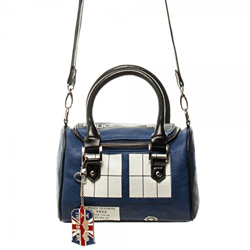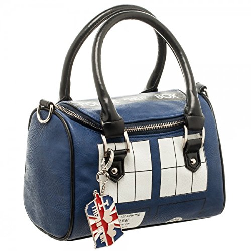 -. Brand : Bioworld -. Color : Blue -. Department : womens -. EAN : 0190371557781 -. Feature : Officially Licensed / 90% PU Leather/10% Polyester / Measures 6.5" x 9" x 5" / Comes with a 48 inch shoulder Strap / Comes with a metal charm that has two hearts -. ProductGroup : Shoes -. ProductTypeName : HANDBAG -. Size : Small -. Title : Doctor Who Tardis Mini Purse with Metal Charm -. UPC : 190371557781