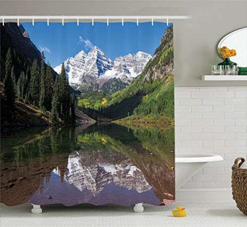 Ambesonne Lake House Decor Collection, Snow Covered Maroon Bells in Autumn Trees Mountain Reflection on Lake Scenery, Polyester Fabric Bathroom Shower Curtain Set with Hooks, Green Blue White