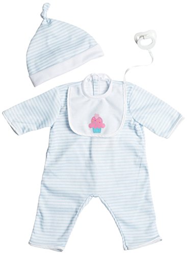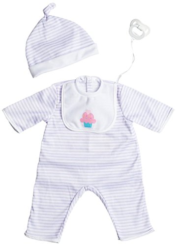 Dressed and ready to play! Our Striped Purple Romper is perfect for most dolls 13" to 16". Quality outfits are machine washable and made to last thru all those diaper changes! Rompers are available in 4 fashionable colors for you to choose from so you can have the best dressed baby doll in the playground. Clothes securely fasten in the back with hook and loop, perfect for little fingers. Sweet little pocket details and matching hat make this outfit extra cute. JC Toys rompers are safe for all dolly mommies and daddies 2+. JC Toys meets and exceeds all Toy Safety Requirements.Feature