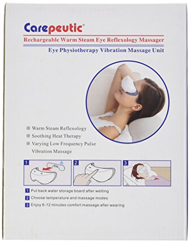 Studio : Carepeutic Publisher : Carepeutic Binding : Health and Beauty Product Description Getting dry, itching and tired eyes? Thinking of device to prevent computer vision syndromes? You need this Carepeutic rechargeable warm steam eye reflexology massager. Utilizing the micro controlled steaming technology, this steam eye massager adopts its thermostat-regulated soothing heat wave with its warm steam to penetrate the skin tissues around eyes, and thus the thermal reaction between the molecules accelerates blood circulation and helps relieve eye fatigue. Its varying low frequency pulse vibration massage with 3 selective massage modes creates different lyrical rhythms and provides comfortable massage to soothe tired eyes in just few minutes. This eye massager is equipped with a detachable micro water storage board. When the two selective temperature levels are initiated, its warm steam inside the compartment starts circulating and its thermal energy is being permeated deep into skin tissues around eyes; thus, eye strain, dryness and fatigue are diminished. This eye massager has independent control of vibration massage. Warm steam therapy can work alone or simultaneously with vibration massage. The auto timer function shuts off the device automatically after 12 minutes of use. Its built in rechargeable battery and touch-panel control let you sit back with peace of mind and enjoy its luxury relief of dry eyes, tired eyes and fatigue. 0