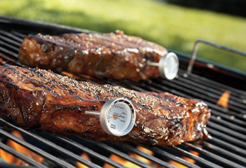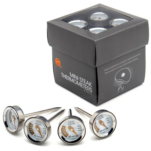 Product Description Cook each steak to perfection using Outset's set of 1" mini-thermometers. Whether your guests like well done and you prefer extra rare, everyone will be happy! Cute as buttons, the set of 4 mini thermometers is easy to tote along for cookouts. Dimensions: 1" dial, 2.25" stem