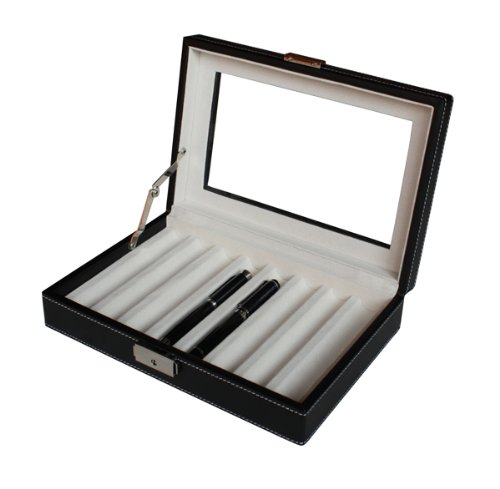 - Feature : Tastefully protects, stores, and organizes up to 8 of your finest pens; Curved slots hold each pen in place / Luxury hinge secures the lid and allows case to open and close with ease / Elegant lock and key offer increased security; Detailed contrast stitching adds a luxury feel; Glass top for dramatic display of your collection / First-class workmanship, material, and design; Beautiful faux suede lining adds style and elegance / Case: 7" L x 10" W x 2.5" H; Pen Compartments: 6.5" L X 1" W