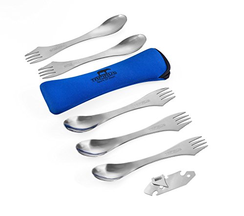 SPOON & FORK COMBINATION UTENSIL FOR VERSATILE USES: If you are keen on camping, lake fishing, hunting in the woods and all sorts of outdoor activities from sports till romantic promenades, then our 5 spork set is the way to go. Use it everywhere you go either picnicking in the park, road tripping with friends or simply having lunch in the office. It comes with a bonus can and bottle opener, because you surely deserve a cold beer during break!