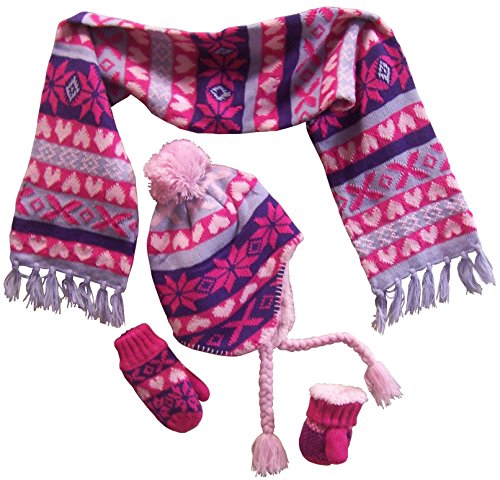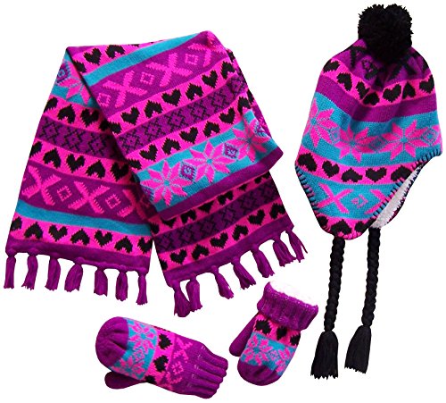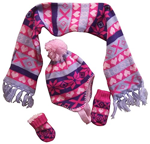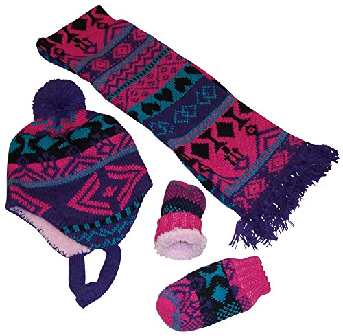 Binding : Apparel Product Description N'Ice Caps girls sherpa lined printed knit set with designs. Full soft sherpa lining in hat and mittens/gloves, scarf is double layered and has fringes. Hard to find product, great quality and design. Sizes: 6-18 months, 2-4yrs and 4-7yrs. For size 6-18 months, the mittens do not have thumbs. For sizes 2-4 years and 4-7 years, the mittens have thumbs. Size 4-7 years is available with either mittens or gloves, as pictured. Color options: pink/purple/fuchsia/lavender; black/neon pink/purple/turquoise; turq/purple/black/fuchsia. N'Ice Caps specialized design and construction. Designed in the USA. This product has been tested and approved as per CPSIA standards. 0