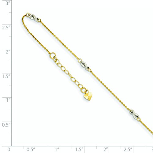 SPECIFICATIONS: Jewelry Type: Anklets, Chain Type: Rope, Anklet Type: Anklets with Stations, Material: Primary: Gold, Material: Primary - Color: Two-Tone, Material: Primary - Purity: 14K, Finish: Polished, Chain Length: 9 in, Chain Width: 1mm, Charm/Element Length: 3mm, Charm/Element Width: 6mm, Clasp /Connector: Spring Ring, Extender Length: 1 in, Feature(1): Adjustable, Texture: Diamond-cut
