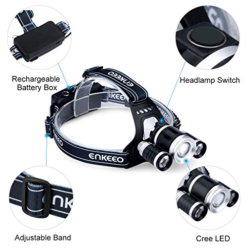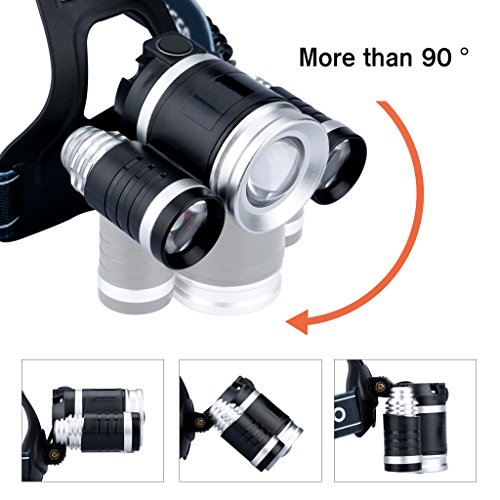 HAND-FREE LED LIGHT: with high quality CREE LED lights (a middle T6 bulb and 2 side XPE bulbs), the headlight offers up to 350 lumens brightness; a built-in red light keeps you safe as alert sign, and the zoomable light spot adds more convenience