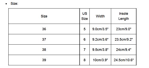 RU/EU/CN 36 US 5 Width 9.0cm/3.5" Insole Lengt 23cm/9.0" RU/EU/CN 37 US 6 Width 9.2cm/3.6" Insole Lengt 23.5cm/9.2" RU/EU/CN 38 US 7 Width 9.5cm/3.8" Insole Lengt 24cm/9.4" RU/EU/CN 39 US 8 Width 10cm/3.9" Insole Lengt 24.5cm/10.6" Package Content: 1X Women's Flip Flops 0