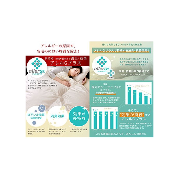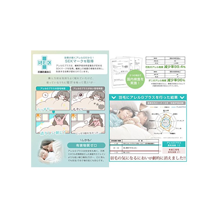 【그 것《루》G플러스】란?SEK마크를 취득 그 것《루》G플러스는 화분이나 다《니》,하우스 더스트 등에 반응하고, 무해화.깃털을 위해서 특수 생성 된 무기염을 사용하는 가공입니다.또한국내 파워 업 가공 것만으로는,효과가 단기 적입니다.그래서,효과가 지속한 그 것《루》G플러스를 채용하고,【국내 파워 업 가공】【그 것《루》G플러스】의 더블 가공으로 언제라도 깨끗한 상태를 유지합니다.