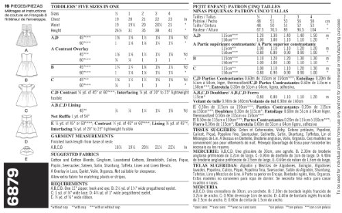 -. Feature : Toddler Dresses in size A (1/2-1-2-3-4), New Look Pattern #6879 / Number of looks included: 5 / Designed in UK, Manufactured in USA / Instructions are written in English, Spanish, and French / Sested fabrics: Cotton and Cotton Blends, Gingham, Laundered Cottons, Broadcloth, Calico, Pique, Poplin, Seersucker, Sateen, Satin, Shantung, Taffeta, Linen and Linen Blends; A Overlay in Lace, Eyelet, Voile, Organza; not suitable for sleepwear