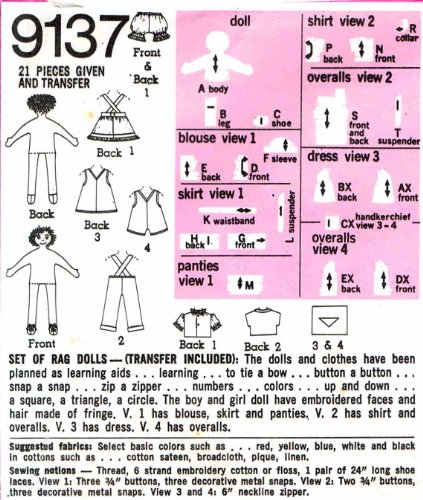 -. Brand : Simplicity -. Feature : Set of Rag Dolls / Teaches how to tie a bow and zip a zipper / Teached how to button a button and snap a snap / Teaches numbers, colors, up and down, a square, a triangle and a circle / Copyright: 1970 -. Label : Simplicity -. Manufacturer : Simplicity -. PackageQuantity : 1 -. ProductGroup : Art and Craft Supply -. ProductTypeName : ART_AND_CRAFT_SUPPLY -. Publisher : Simplicity -. Studio : Simplicity -. Title : Simplicity 9137 Vintage Sewing Pattern Educational Rag Dolls