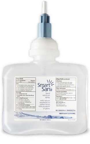 Studio : Best Sanitizers, Inc Publisher : Best Sanitizers, Inc Binding : Misc. Product Description Best Sanitizers Smart-San ES (65 percent Ethanol) Hand Sanitizer Spray kills 99.999 percent of 26 tested pathogens in 15 seconds. FDA approved as a no-rinse product (Fragrance-Free only), there is no place Smart-San can't go. Smart-San is dispensed in an atomized spray, ensuring total saturation of the most critical parts of the hands: the nails and cuticles. The liquid formula will never clog a dispenser. Smart-San leaves no sticky residue on the skin and contains emollients to help soften the skin. Compatible Dispensers: AD10048, AD10048B, MD10030, MD10030B. 0