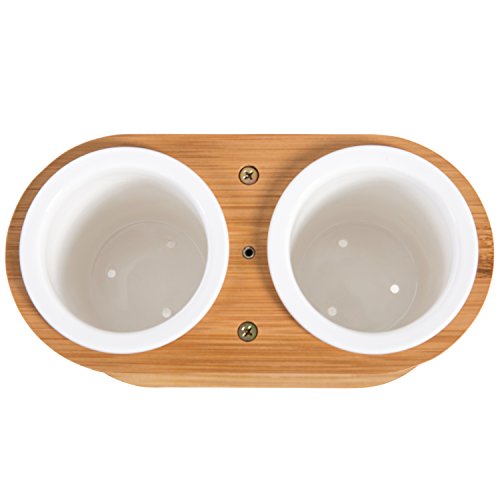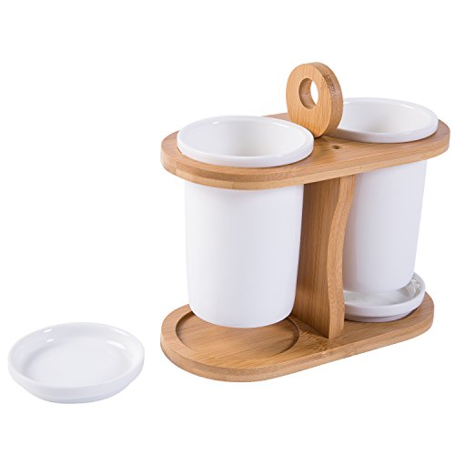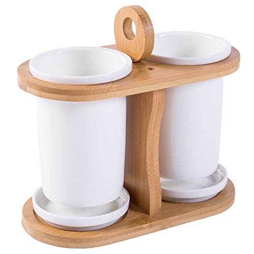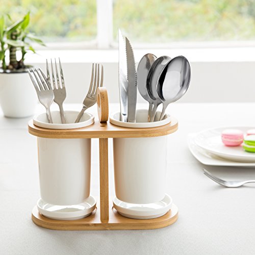 Removable Ceramic Utensil Holder with Oval Shape Bamboo Rack, Flatware Organizer, White
