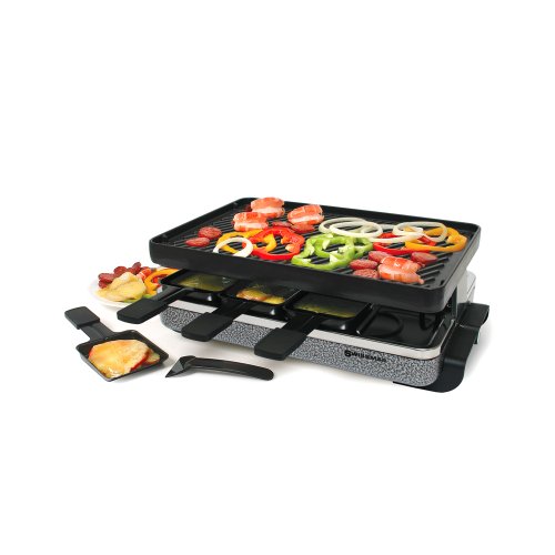 8-Person Eiger Raclette has a non-stick reversible grill/crepe grill top that measures 9 by 14-inch