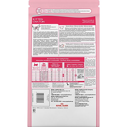 Royal Canin Kitten 36 contains an exclusive combination of nutrients helps support the young kitten's digestive health. Unique complex of antioxidants (vitamins C and E, lutein, taurine) and prebiotics help support the kitten's natural defenses. A balanced content of highly digestible proteins, vitamins and minerals help support the development of the kitten's bones and muscles. Dry cat food designed specifically for kittens up to 12 months old. Size: 7 pounds.Feature