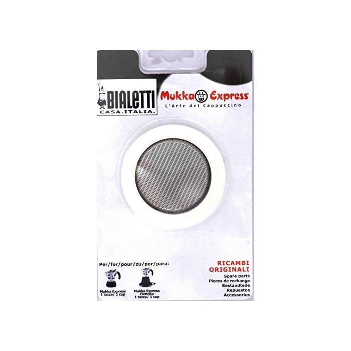 These original Bialetti spare parts contain one replacement seal and one replacement aluminium filter suitable for Bialetti Mukka Express Cappuccino makers. Blister packed
