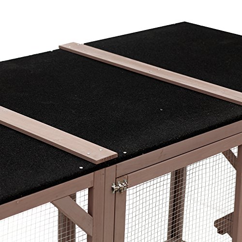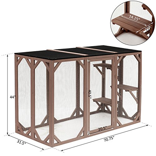 -. Feature : ✔ LARGE CAT ENCLOSURE: This fully enclosed outdoor wooden cat enclosure, or Catio, a great addition to your patio or backyard and is perfect for one, or multiple cats to play or lounge and relax in. / ✔ 3 ELEVATED PLATFORMS: Designed with 3 large platforms, this cat house provides ample space for your feline friend to do outdoor activities like climbing, jumping, or relaxing. / ✔ DURABLE WOOD AND WIRE ENCLOSURE: Made around a solid fir frame that is sealed with animal safe, non-toxic sealant and enclosed with strong metal wire, your cat can safely enjoy the outdoors. / ✔ WEATHERPROOF DESIGN: The flat roof is covered with asphalt for enhanced weather protection against both sun and rain, helping your cat enjoying the great outdoors without direct impact from the weather. / ✔ LARGE CONVENIENT DOOR: Large front door, with safety latches, creates an easy access point to put your can into, and pull your cat out of, this amazing catio.