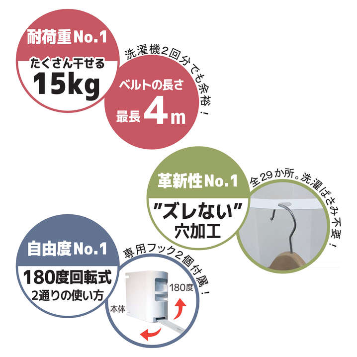●幅135mm×高さ100mm×厚さ47mm 最長4m 最大荷重:15kg 本体回転範囲 180度