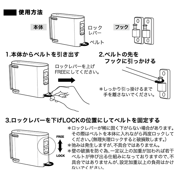 ●コンパクトなボディに最長4mのベルトを内蔵、自由な長さでロック可能。