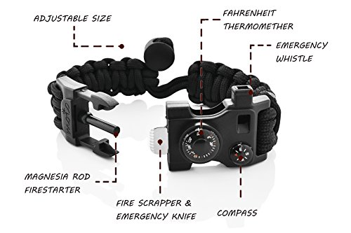 - 13-in-1 OUTDOOR SURVIVAL GEAR: Stylish Survival Paracord Bracelet that includes a Paracord Rope, a Flint Fire Starter, Emergency Whistle, Compass for a maintained sense of direction, FAHRENHEIT THERMOMETER (not Celsius like others), Scrapper, and a 8-IN-1 Mini MULTI TOOL CARD with a variety of screwdrivers, and wrenches.