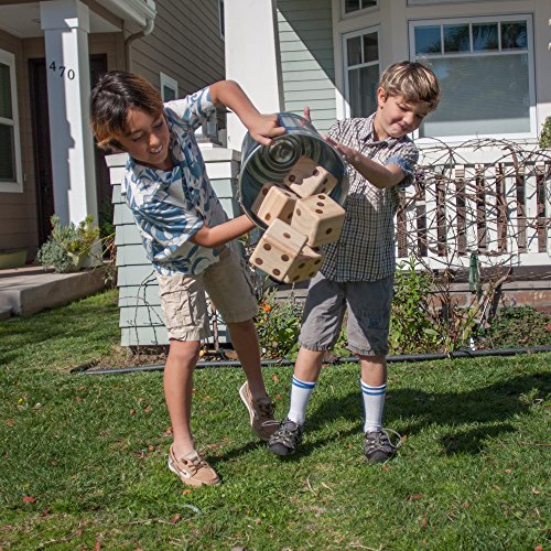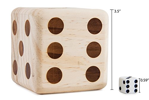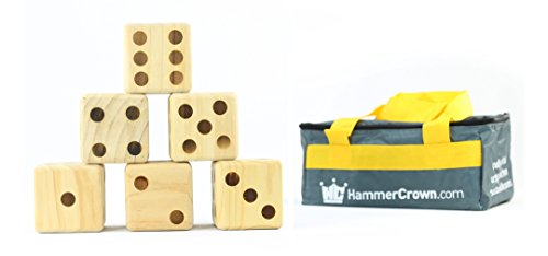 Enjoy the ultimate game of dice in your backyard with this giant wooden dice set. All six beautiful Hammer Crown brand giant dice are made using solid wood from sustainable sources. All giant dice are not created equal, so check the details before you buy. Why? What makes these so good? The Hammer Crown brand giant dice are made from solid wood that is precision cut and sanded to perfection before the pips are heat branded directly into the wood. No rough edges or splinters here, these dice are so good looking you will want to put them on the shelf when you are not playing them. Includes storage bag with zip closure and convenient handles for transport. Play dice games like Yahtzee, Farkle and Bunco and have giant sized fun! Make them part of your collection today! 0