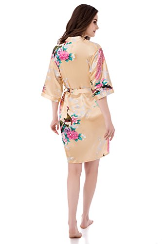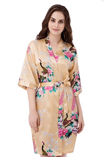gusuqing Women's Printing Peacock Kimono Robe Short Sleeve Silk Bridal Robe Gold S