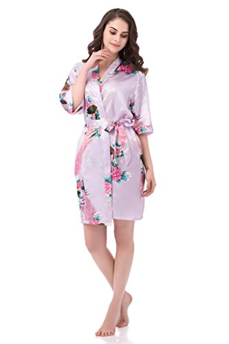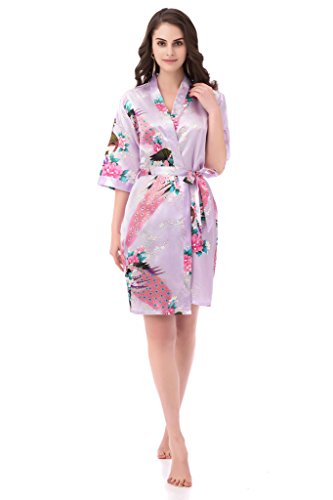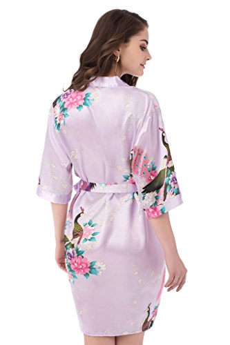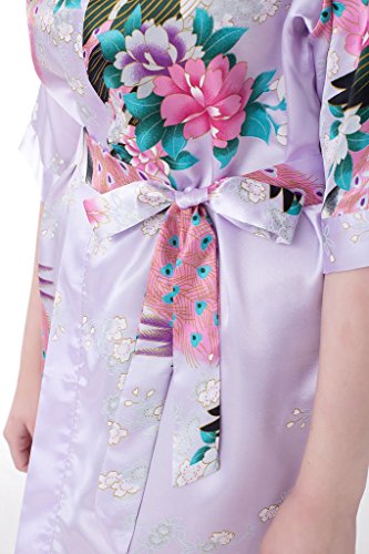gusuqing Women's Printing Peacock Kimono Robe Short Sleeve Silk Bridal Robe Light Purple L