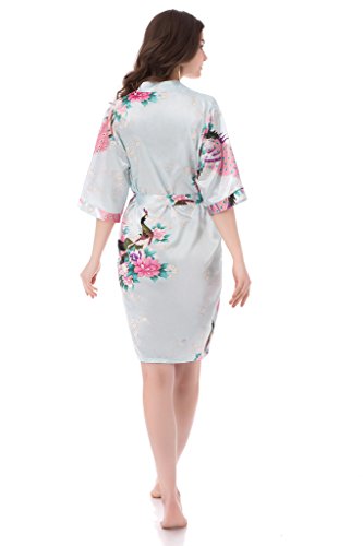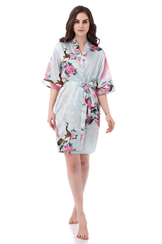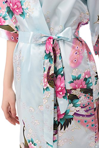 gusuqing Women's Printing Peacock Kimono Robe Short Sleeve Silk Bridal Robe Light Blue M