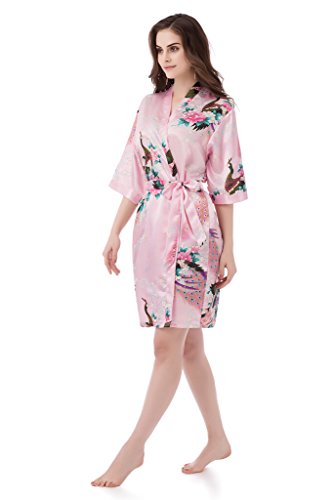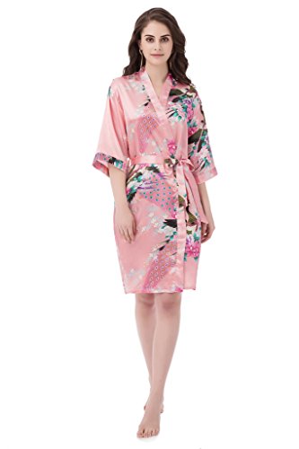 gusuqing Women's Printing Peacock Kimono Robe Short Sleeve Silk Bridal Robe Pink S