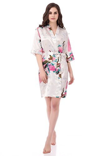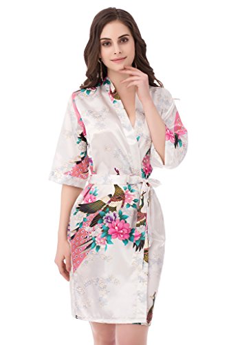 gusuqing Women's Printing Peacock Kimono Robe Short Sleeve Silk Bridal Robe White M