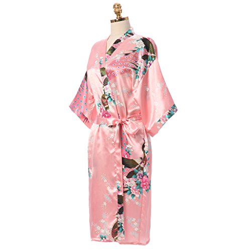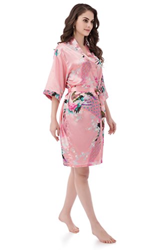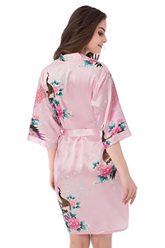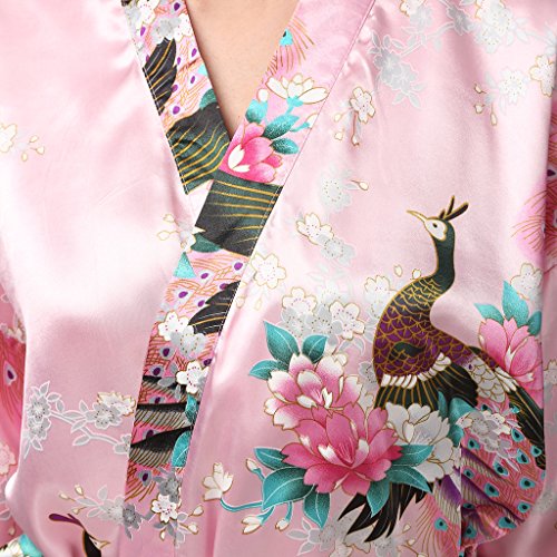 gusuqing Women's Printing Peacock Kimono Robe Short Sleeve Silk Bridal Robe Pink L