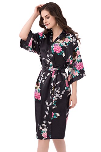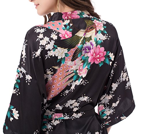gusuqing Women's Printing Peacock Kimono Robe Short Sleeve Silk Bridal Robe Black M