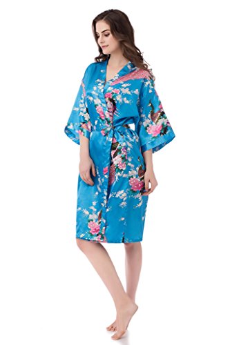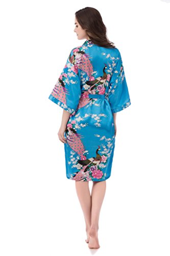 gusuqing Women's Printing Peacock Kimono Robe Short Sleeve Silk Bridal Robe Turquoise M