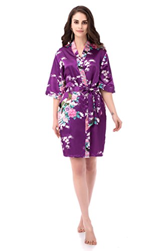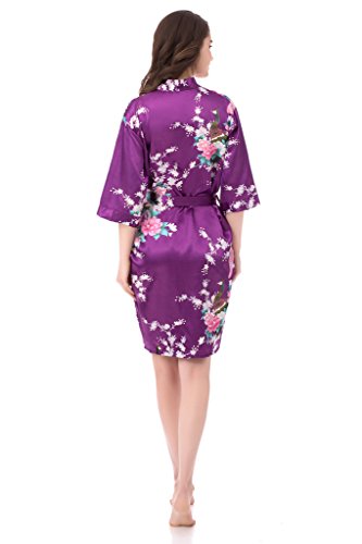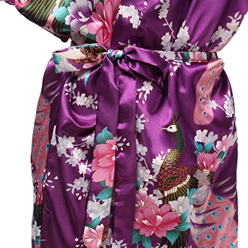 gusuqing Women's Printing Peacock Kimono Robe Short Sleeve Silk Bridal Robe Plum L