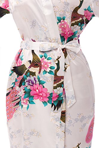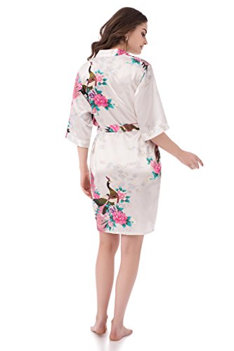 gusuqing Women's Printing Peacock Kimono Robe Short Sleeve Silk Bridal Robe White L
