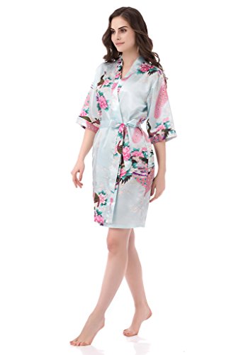 gusuqing Women's Printing Peacock Kimono Robe Short Sleeve Silk Bridal Robe Light Blue S