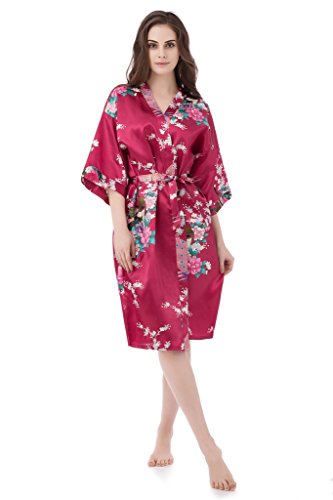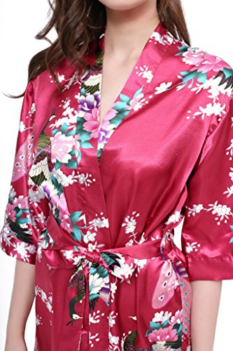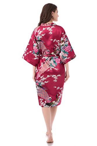 gusuqing Women's Printing Peacock Kimono Robe Short Sleeve Silk Bridal Robe Burgundy M