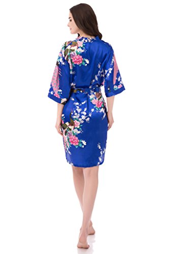 gusuqing Women's Printing Peacock Kimono Robe Short Sleeve Silk Bridal Robe Royal M