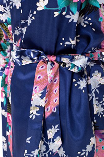 gusuqing Women's Printing Peacock Kimono Robe Short Sleeve Silk Bridal Robe Navy L