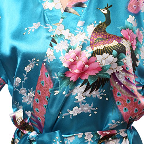 gusuqing Women's Printing Peacock Kimono Robe Short Sleeve Silk Bridal Robe Turquoise L