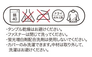 | ご使用上のご注意 | ●ポリウレタン素材が火気に対し引火性がありますので火気には十分お気をつけください。 ●気温が約10℃以下になりますと性質上硬化しますが使用上影響はありません。 ●生地部分に爪を立て、無理に引っ張ると破れるおそれがありますのでご注意ください。 ●使用感には個人差があります。 ●カバーのみ洗濯できます。中材は洗濯できません。汚れた場合は固く絞った布等でしっかりと拭いて風通しのよい場所で陰干ししてください。 ●中材を包んでいる生地にカバーとの摩擦によって毛玉が付く場合がございますが、使用上問題ございません。気になる場合は市販の毛玉取り器や、毛玉取りブラシをご使用ください。 ●乳幼児の手の届かない場所に保管してください。 ●火気のそばや高温多湿な場所、直射日光の当たる場所には保管しないでください。 ●本来の目的以外でのご使用はおやめください。 ●印刷の都合上、実際の商品と多少色が異なる場合があります。 |