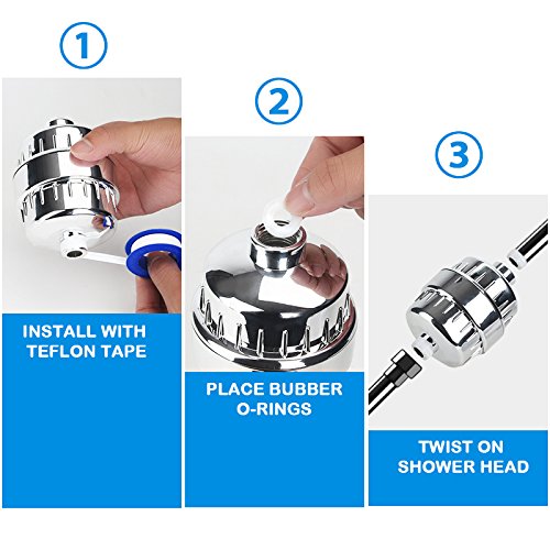 - ✅HIGH WATER OUTPUT – Keep your water pressure with high water flow output. This hard water shower filter works with water from 41°F to 140F°.