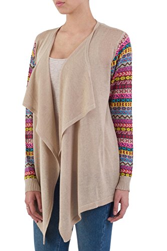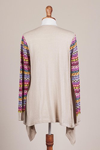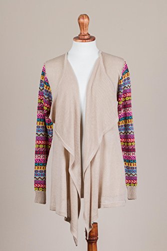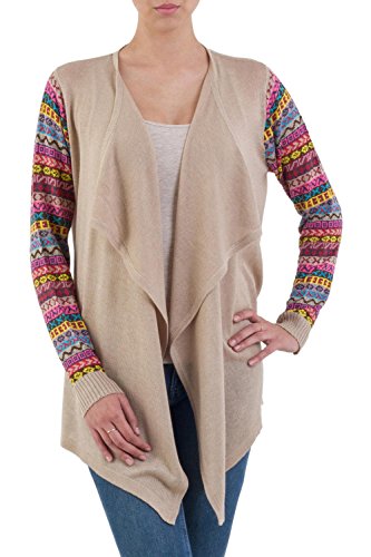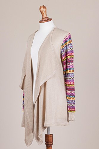 About this item: Comfort and style meet in this open-front cardigan from Peru. Slip the open-front cardigan on for your market stroll or evening walk. Designed by Fernando Cano, this cardigan features colorful striped sleeves knit with geometric Inca-inspired patterns and an open, flowing front. You'll be subtle and soft in this pale beige cardigan. ... 0