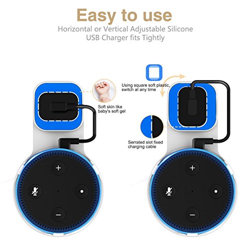 How to use: 1. Slide the Echo Dot 2 into the hook section from the top of the stand 2. Connect the USB cable to Echo Dot 2 and socket respectively 3. Insert the USB socket into the socket of the bracket 4. Hold the entire bracket in your hand and plug it into the wall socket
