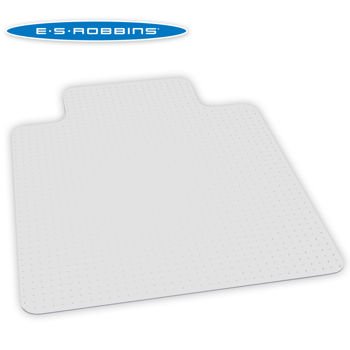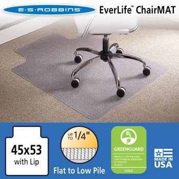 -. Binding : Office Product -. Brand : ES Robbins -. Color : Clear -. Feature : •Office Chair Mat / •AnchorBar® chairmat cleat system holds securely, yet are gentle on carpet and fingers / •Protects high-pile carpets up to 1" thick including padding / •Crystal edge for smooth transition to/from floor surface / •Ideal for intensive office use (usage over 8 Hours/200+ lbs) -. Label : E S Robbins -. Manufacturer : E S Robbins -. PackageQuantity : 1 -. ProductGroup : Office Product -. ProductTypeName : OFFICE_PRODUCTS -. Publisher : E S Robbins -. Studio : E S Robbins -. Title : ES Robbins Chair Mat for Flat/Low Pile Carpet, 45" x 53" w/Lip, Clear