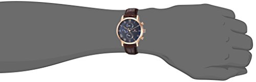 Gold-tone stainless steel case. Leather strap. Blue dial. Quartz movement. Date. Chronograph. Water resistant 30 meters. Case 44mm.