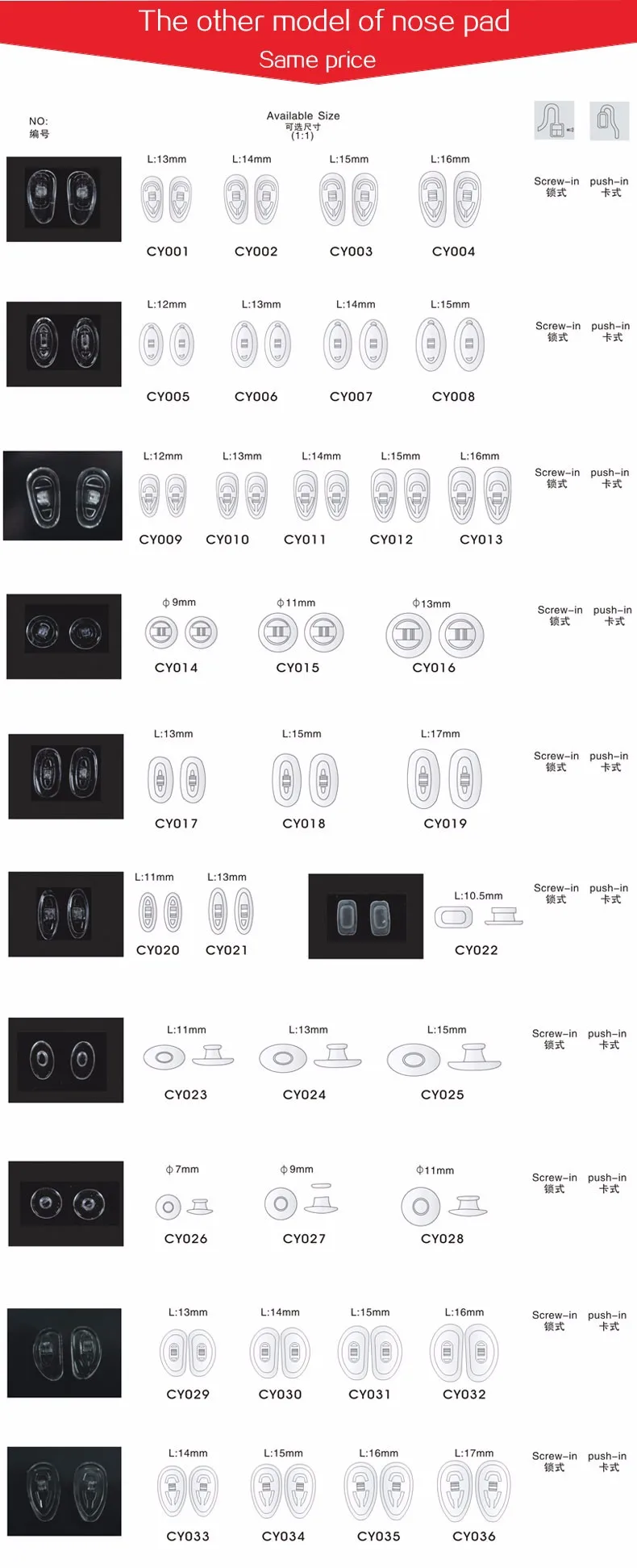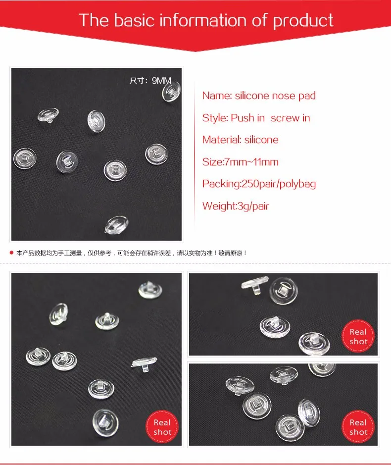 1. 재료: 실리콘 코 패드 2. 나사-, 푸시- 사용할 수 있습니다 3.패키지: 250 쌍 당 가방( 가방 당 PC 500) 4. 좋은 품질과 빠른 배송