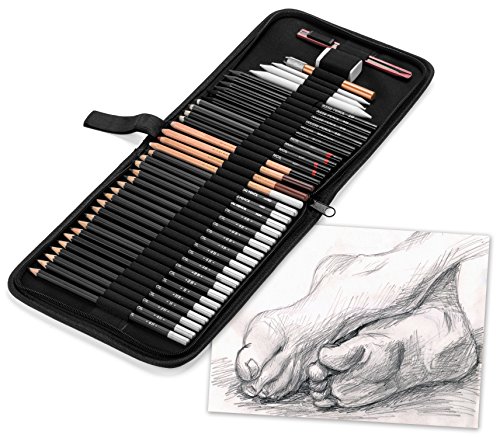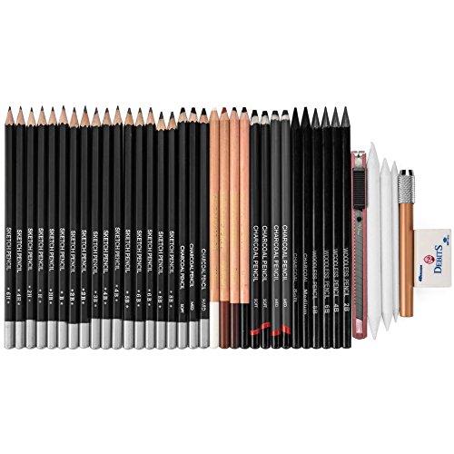 40 Piece Professional Drawing and Sketching Pencil Set - Graphite and Charcoal Artists Pencil Kit with Travel Case