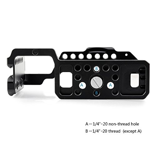 With enough space on the left side, in a easy way you can mount HDMI clamp 1822. A right side NATO rail and 1/4’’ & 3/8’’ mounting holes enable an access to mount more rigs. This cage features an Arca QR plate on the bottom, so you can directly attach it to the Arca QR baseplate. Or, you can mount other QR plates through two 1/4’’ screws based on your need
