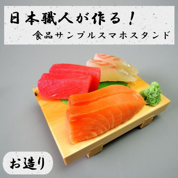 寿司下駄に乗ったお造りがスマホスタンドに☆ちゃんとワサビもついています。見ているだけでお腹が空いてしまうほどのクオリティ!食品サンプル好きにはたまらない商品です。動画視聴や画像の閲覧にとっても便利。 |